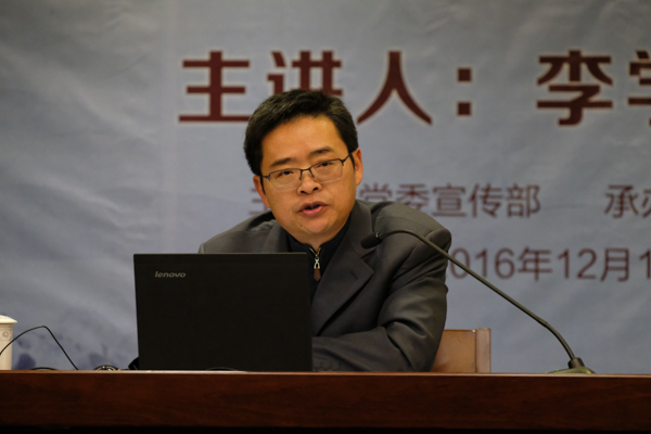我校把胡瑗“明体达用”教育思想作为校训,并以胡瑗先生名字命名了校园景点和活动,如胡瑗大讲堂、胡瑗广场等。我校在胡瑗文化研究上一直在努力,从未止步,也取得了不少优秀成果。李教授从“祥钟淮海,秀毓苏湖”这样一副对联说起了胡瑗先生的生平。胡瑗先生家中世代为官,世世清廉。“祥钟淮海”特指先人胡威的清正廉洁。在良好的家训家风中,胡瑗自小显现出不凡的天赋,七岁善属文,十三通五经,即已圣贤自期许。曾有邻居称赞他“此子乃伟器,非常儿也”。他的才学以及在苏州、湖州近二十年的春风化雨为他赢得了“秀毓苏湖”的美誉。